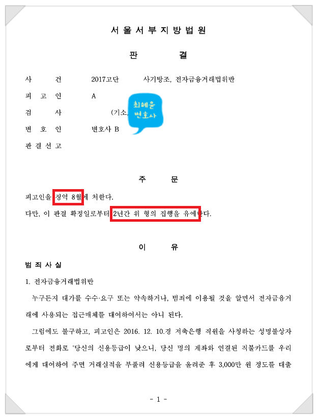 사기방조, 전자금융거래법위반 사건 : 징역 8월 및 집행유예 2년