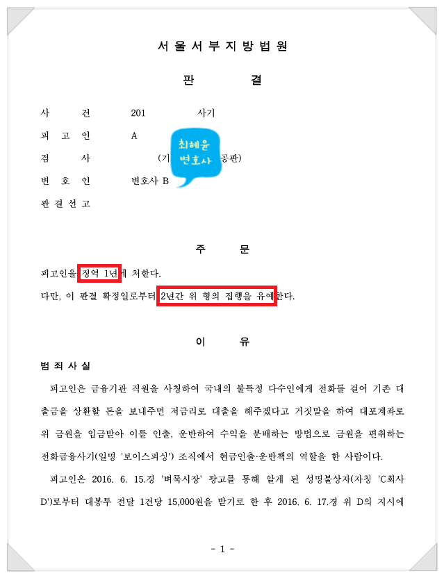 아래에서는 최혜윤변호사 가 사기방조죄와 사기죄에서 각각 집행유예판결을 받았던 사례를 소개합니다.