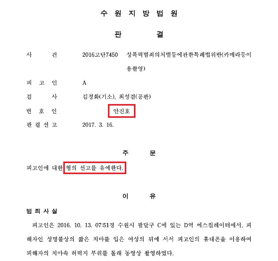 그런데 피고인이 지하철역 에스컬레이터에서 성명불상 피해자의 치마 속을 촬영한 것이었기 때문에 피해자를 확인할 수 없어 안타깝게도 합의를 진행할 방법이 없었습니다.