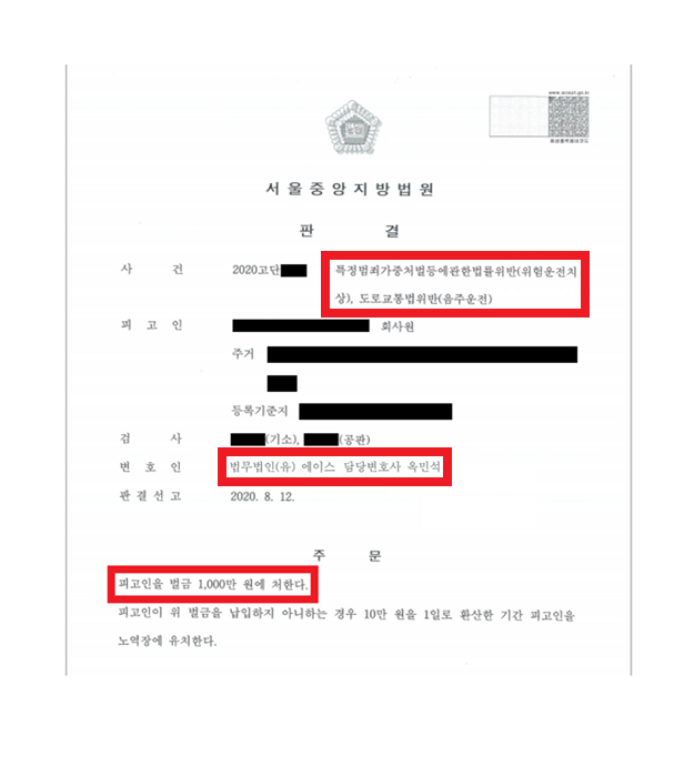 이러한 저의 조력을 바탕으로 A씨는 음주운전 이진아웃에 교통사고까지 일으켜 인적·물적 피해를 가하였음에도 불구하고 벌금형을 선고받음으로써 회사에서 당연히 퇴직하게 될 위기에서 벗어날 수 있습니다.
