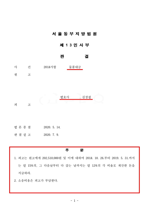 주위적으로 원고는 피고의 지사장과 물품공급계약을 체결했으므로 피고가 물품대금을 지급할 의무가 있고, 예비적으로 이 사건 계약의 체결 경위 등을 살펴보면, 최소한 피고는 원고에게 명의대여자 책임 또는 사용자 책임에 의해 물품대금을 지급할 의무가 있다고 주장, 입증을 해 나갔습니다.