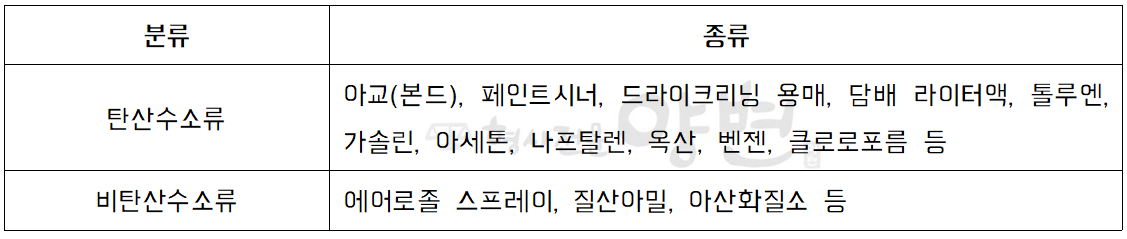 화학물질관리법이 규율하는 환각물질은 형태에 따라 ① 휘발성 용매, ② 에어로졸, ③ 가스, ④ 질산염 흡입제로 세분화하거나, 성분에 따라 ① 탄산수소류, ② 비탄산수소류로 세분화할 수 있고, 성분에 따라 종류를 나열하면 아래 표와 같이 정리할 수 있습니다.