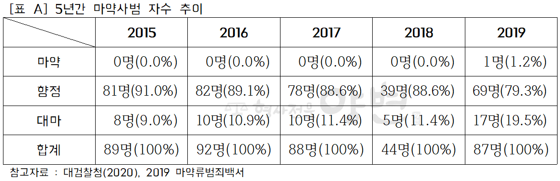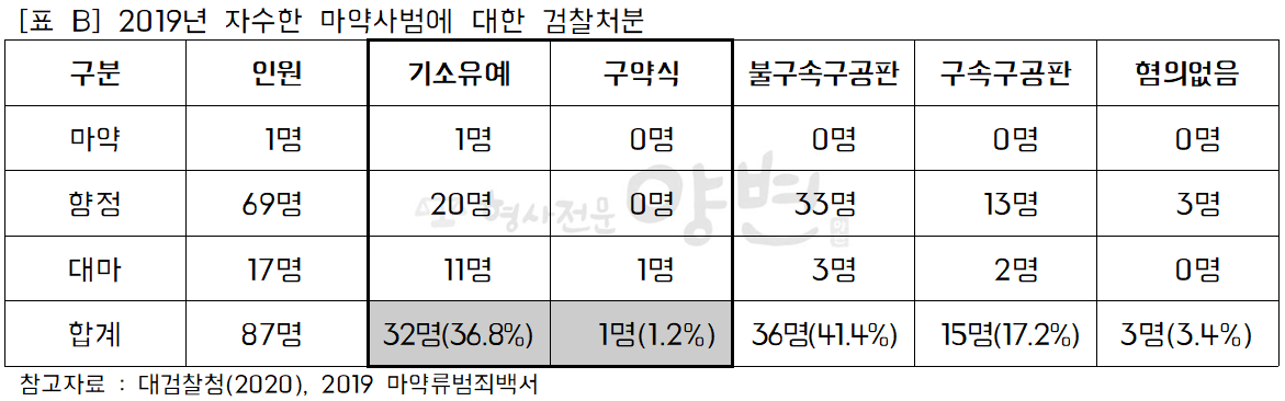 실제로 법원판결 뿐 아니라 검찰처분에 있어서도 마약 사범이 자수한 경우, 선처를 고려하고 있습니다. 아래 [표 A]는 5년간 마약사범의 자수 추이를 정리한 것으로, 2019년 한해만 하더라도 87명이 자수하였고, [표 B]에서 확인할 수 있듯이 그 중 구속구속판 처분을 받은 마약사범은 17.2%인 15명에 불과하고, 기소유예나 구약식으로 경한 처분을 받은 마약사범은 33명으로 38%에 달합니다.