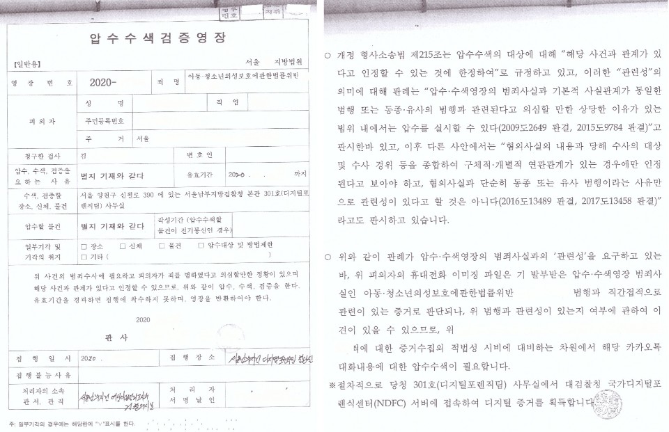 포렌식 참관은 실익이 있다고 생각하지도 않으며, 수사관들 그렇잖아도 업무가 많고 바쁘게 고생하는데 포렌식 참관한다고 번거롭고 힘들게 하는 것은 결코 추천하지 않습니다. 또한 잘 싸우고 다툴 수 있는지를 중요하다고 주장하는 사람도 있을 수 있으나 수사절차는 기본적으로 수사관과 싸우는 절차가 아니라, 성실히 조사에 임하고 자신의 억울한 점이 있다면 이를 억지주장이 아닌, 경험칙에 부합하게 합리적으로 납득할 수 있도록 밝히는 것입니다. 유죄의 증거가 산재한 상황에서 콘크리트게임으로 가는 것은 결과에 있어 결코 도움되는 것도 아닙니다. 수사관으로서는 마음만 먹는다면 아래와 같이 추가 영장(수사단계에서 제가 변호한 사건이 아니며 재판단계에서 선임되었음)을 받는 것이 별로 어려운 것이 아니며(압수수색영장은 인신의 자유가 제한되는 구속과 달리 기본권 침해의 정도가 크지 않아 발부받는 것이 어렵지 않음) 이를 통하여 더욱 철저한 수사를 할 수 있다는 점도 고려하여야 할 것입니다.