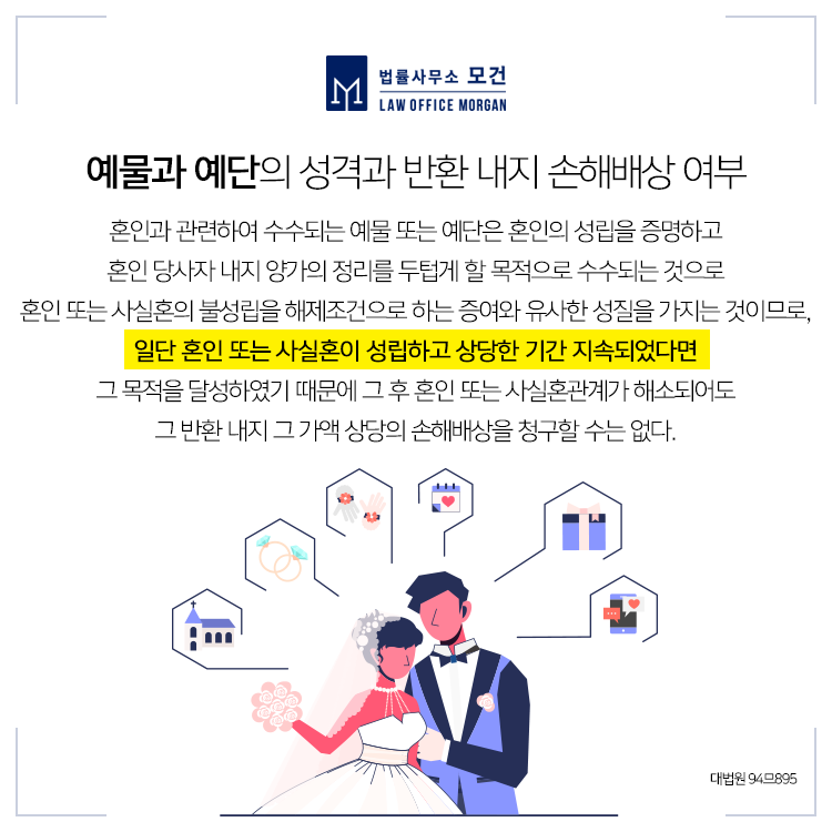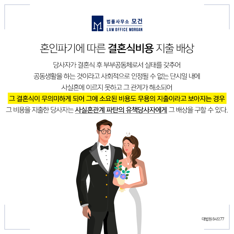 사실혼 부당파기에 대한 위자료를 청구하기 위해서는 부당파기에 대한 사유가 있어야 합니다. 만약 이를 입증하지 못한다면 청구는 기각될 수 있습니다. 또한 결혼식비용, 예물·예단은 혼인이 불성립되어 무의미하게 된 경우 배상을 구하거나 반환을 구할 수 있는데 이는 유책배우자라면 불가하고, 배상이나 반환을 위해서는 그 혼인이 부부공동체로서 의미를 둘 수 없을 정도로 단기간 내에 관계가 해소되었음을 입증하여야 하니 이혼전문변호사의 충분한 법률조력을 필요로 합니다.
