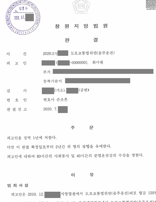 최근 음주운전 전력이 많은 경우 실형을 선고하는 경향때문에 의뢰인이 걱정을 많이 하였으나, 손조흔 변호사의 적극적인 변론과 의뢰인의 진심어린 반성등으로 참으로 다행스러운 결과를 얻을수 있었습니다.