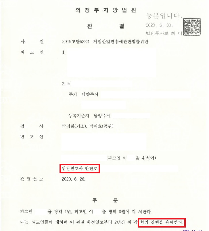 이 사건 판결문을 보면 재판부에서 '피고인이 장기간에 걸쳐 게임물 관련사업자가 제공하지 않은 사설서버를 운영하며 게임물의 아이템을 환전하는 등의 행위로 다액의 이익을 취하였는바, 게임산업의 건전한 발전 등을 위해 피고인에 대한 징역형의 선고가 불가피하다'는 판단을 하고 있음을 확인할 수 있습니다.