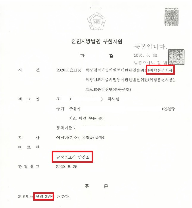 음주 사망사고에서 가장 중요한 양형인자인 '처벌불원' 즉 사망한 피해자의 유족들과 합의가 이루어지지 못하였음에도 불구하고 위와 같이 적극적인 양형 변론을 통하여 법정 하한인 징역 3년이라는 형을 선고받을 수 있었고 이에 피고인은 항소를 포기하여 형이 확정되었습니다.