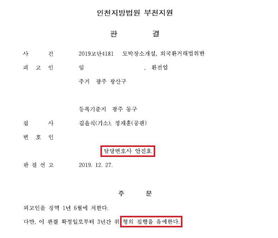 또한 정캣업자 및 다른 환전상 등 공범과의 공모한 도박공간개설 혐의에 대하여는, 본 포스트에서 구체적으로 기재할 수는 없으나 '최대한 방어'하여 원정도박자들 중 단 2명에 대한 롤링 혐의만 인정되게 되었습니다.