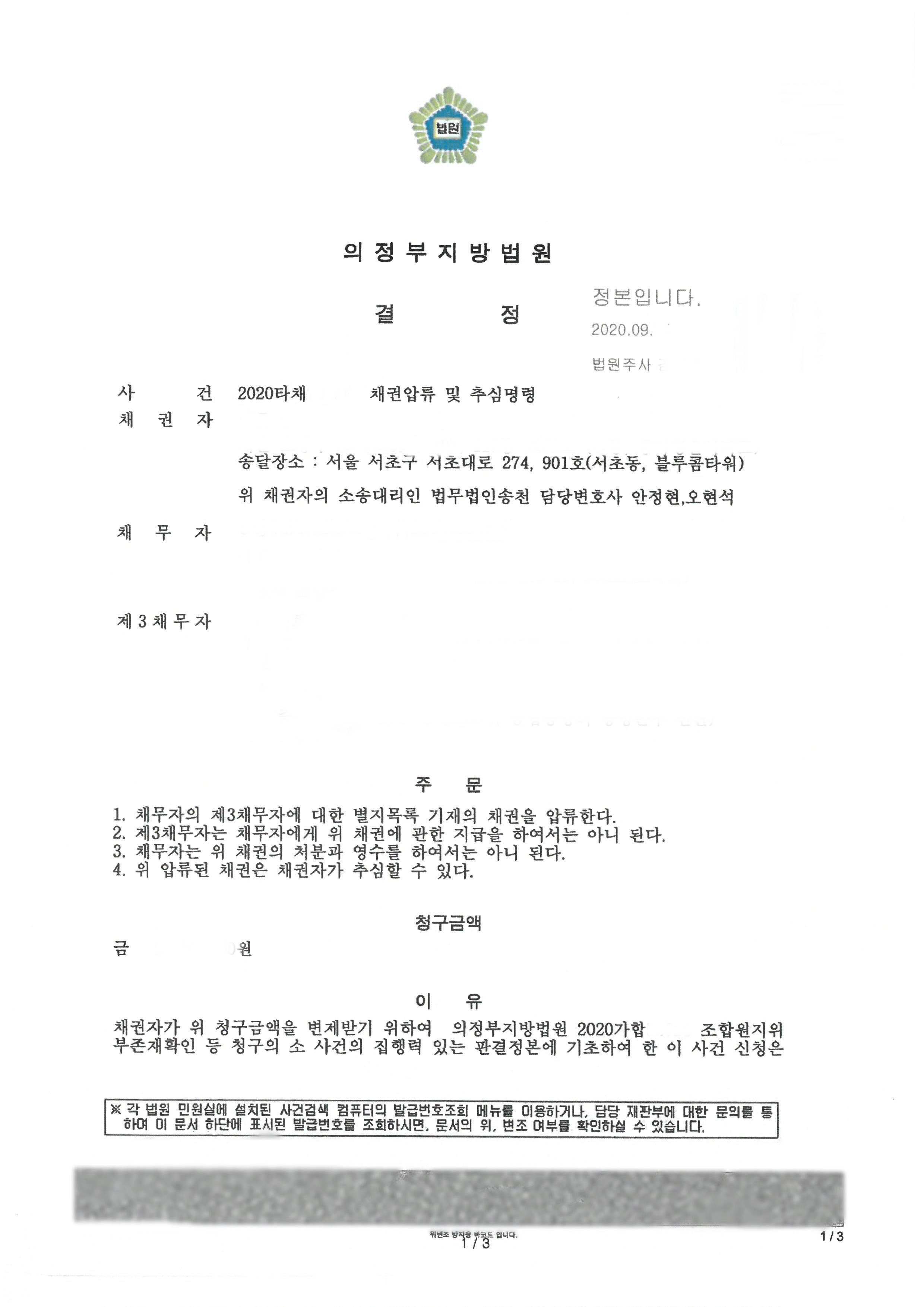 현재는 B조합을 채무자로하여 B조합이 C신탁회사에 가지고 있는 신탁수익금 및 정산금 채권과 주거래 은행D의 예금채권에 대한 압류추심명령을 받아 1차적으로 채권을 확보한 상태이며, 추가적인 채권추심 단계를 밟고 있습니다.