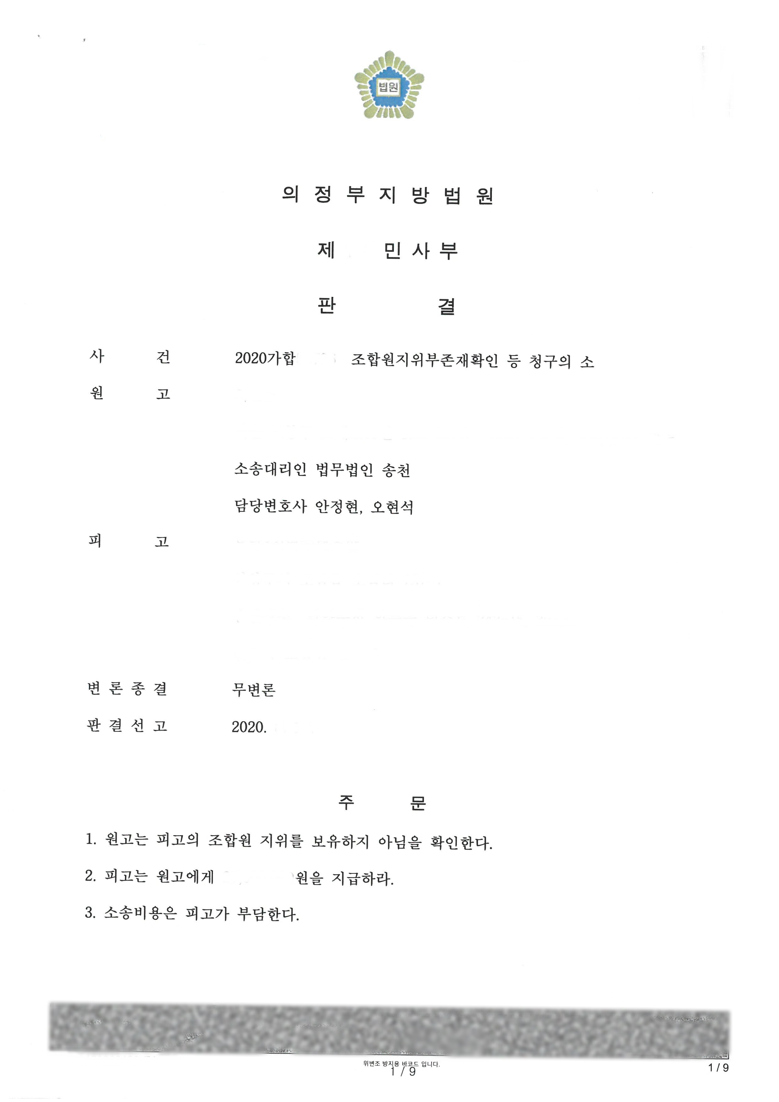 A는 B조합을 상대로 계약해지를 원인으로 계약금 반환 및 조합원지위부존재확인의 소를 제기하였고, B조합의 행위가 부당하며 B조합이 일부 탈퇴를 약속한 부분에 대해 입증할 수 있었고 결국 B조합을 상대로 전부승소할 수 있었습니다.