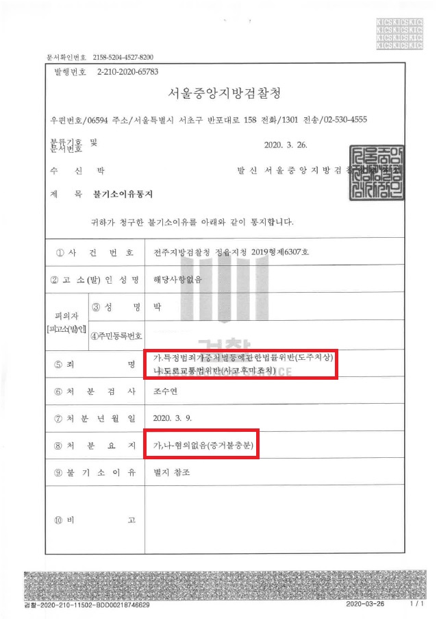 위와 같이 2단계(음주/뺑소니)로 이루어진 변호인의 전략적인 변론을 통하여 피의자는 혐의없음(증거불충분)으로 불기소처분을 받게 되었습니다.
