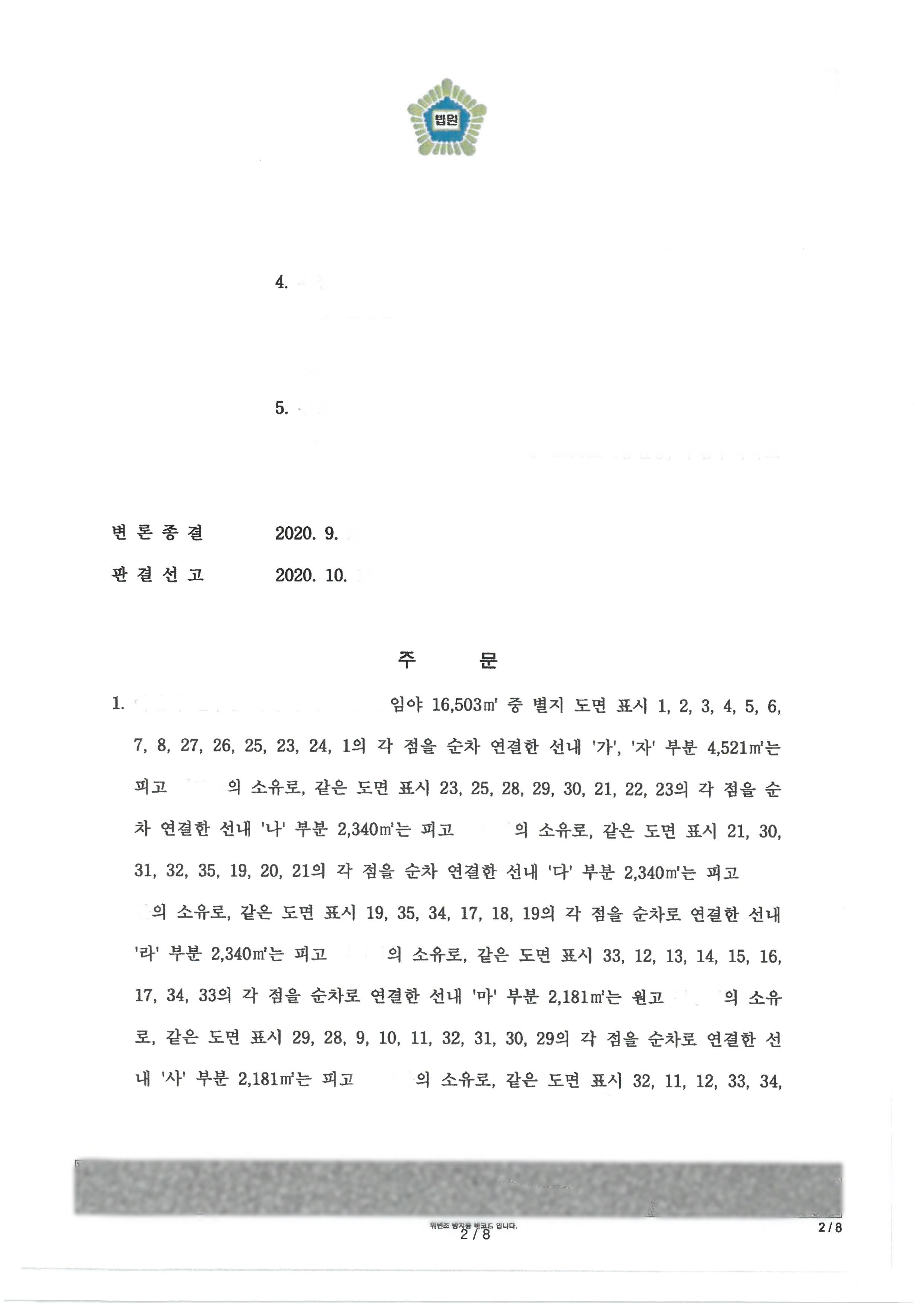 이후 재판부와 원고 및 피고들과 해결방안에 대해 여러 차례 논의를 하게 되었고, 공유물분할 소송의 경우 현물분할이 원칙임을 고려하여 결국 토지를 분할하여 소유하는 방향으로 협의가 되었습니다. 다만, 누가 어떤 토지의 어떤 면적을 가져갈지에 대해 다시 논의가 오갔고 결국 A가 제안한 토지분할방안에 대해 다른 공유자들이 동의하게 되었습니다. 다시 A 및 공유자들이 원하는 각 분할 대상 목적물 및 면적을 두고 측량감정을 신청하여 특정을 하게 되었고, 최종적으로 토지에 대한 현물분할 판결을 이끌게 되었습니다.