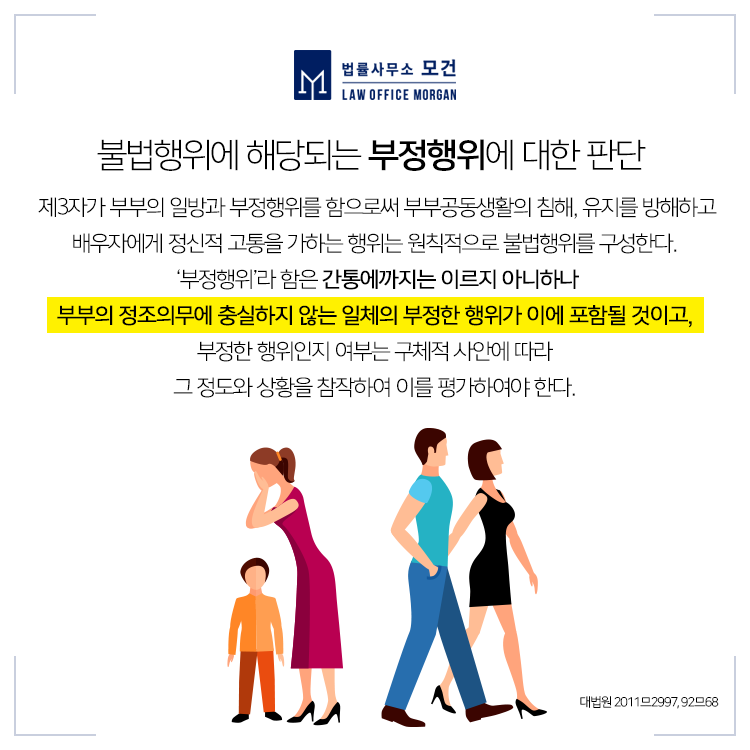 예전에는 '간통'이라는 단어를 썼지만 간통죄가 사라지면서 현재 법에서는 '부정행위'라고 표현하고 있습니다. 부정행위는 '올바르지 못한 행위'를 뜻하는 말로 단순 성적인 관계만을 의미하는 것이 아니라 부부의 정조의무에 충실하지 않는 일체의 부정한 행위를 말합니다.