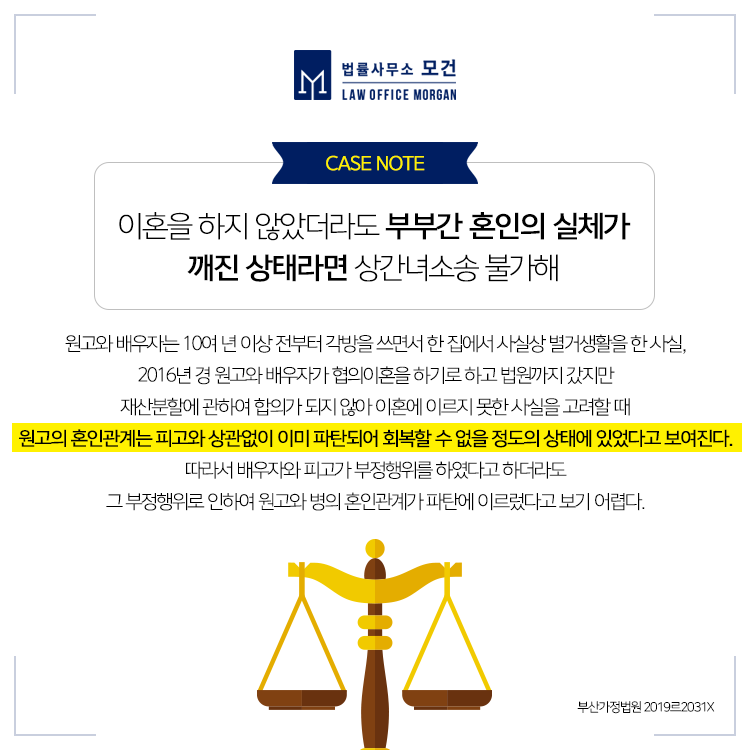 단, 상간녀·상간남소송은 이미 부부간 혼인의 실체가 깨진 상태에서 배우자가 부정행위를 한 경우라면 받아들여지기 어렵습니다. 상간녀·상간남 위자료청구소송은 그들의 부정행위가 자신의 혼인생활 파탄의 원인이 되었을 때 청구할 수 있음을 유념하시기 바랍니다.