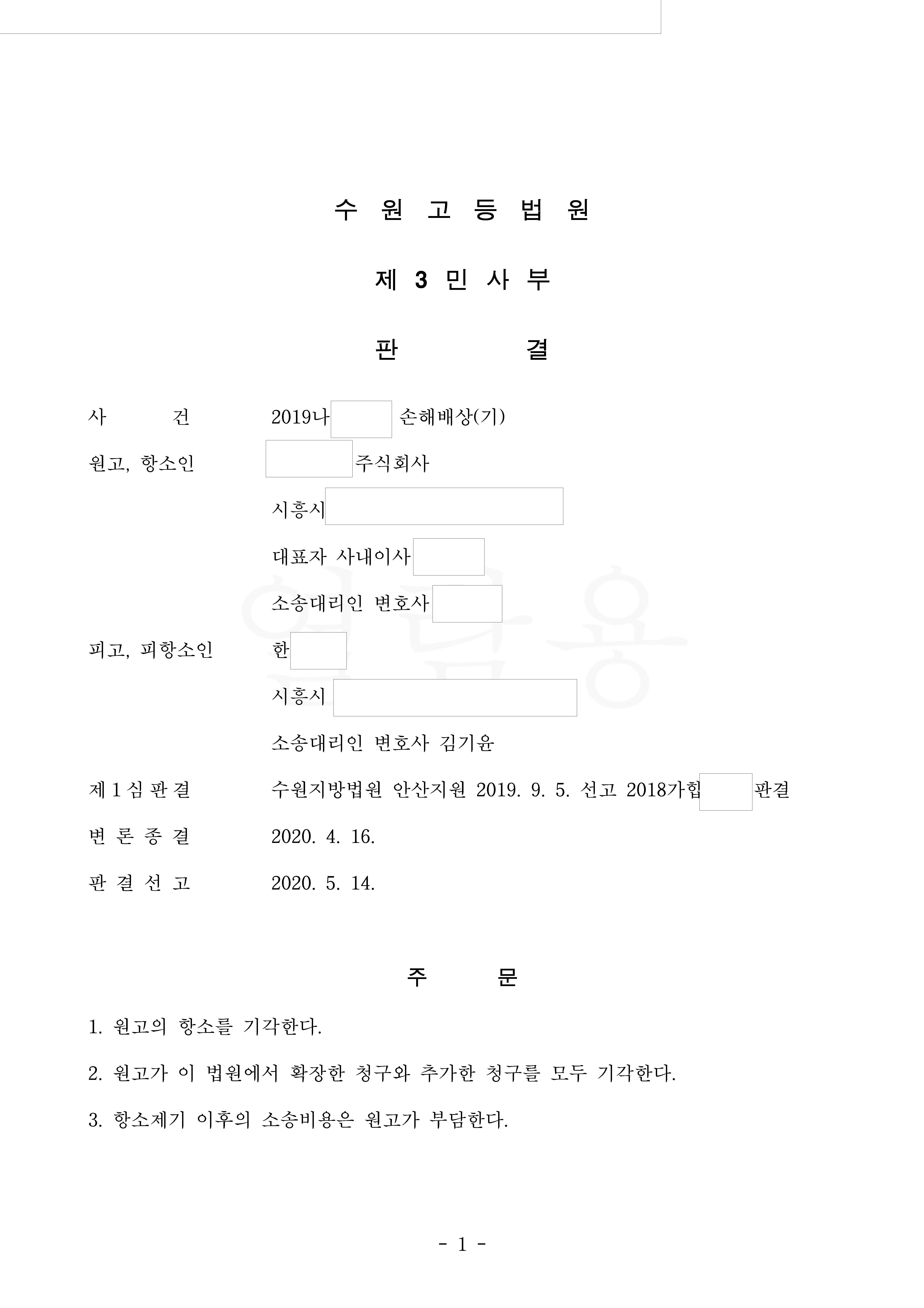 피고 승소판결로 ‘원고의 청구를 기각하고 소송비용은 원고가 부담한다’는 주문을 받았습니다.