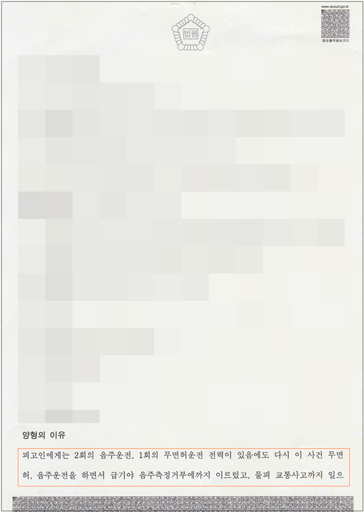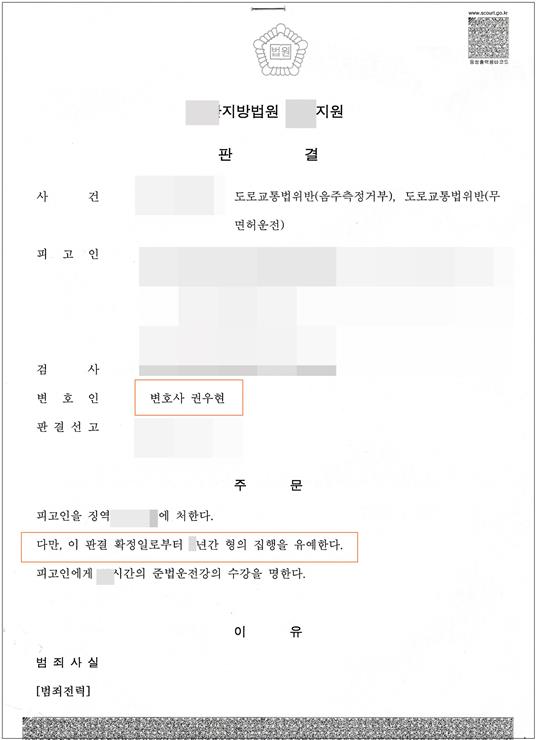 아래 판결 이유 기재와 같이 2회 음주운전, 1회 무면허운전의 전력이 있음에도 다시 무면허운전, 음주운전을 하면서 급기야 음주측정거부에까지 이르렀고, 물피 교통사고까지 야기한 사건에 대하여, 변호인인 본인이 수사단계에서부터 입회하여 양형자료를 제출하고, 과거 대법원사건 변론 시 양형에 관하여 법원이 취하여야 하는 일반적인 태도와 그 법리적인 논거를 잘 활용하여, 다행히 집행유예로 피고인을 구출한 사례입니다.