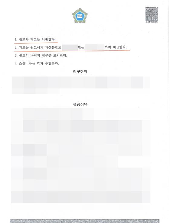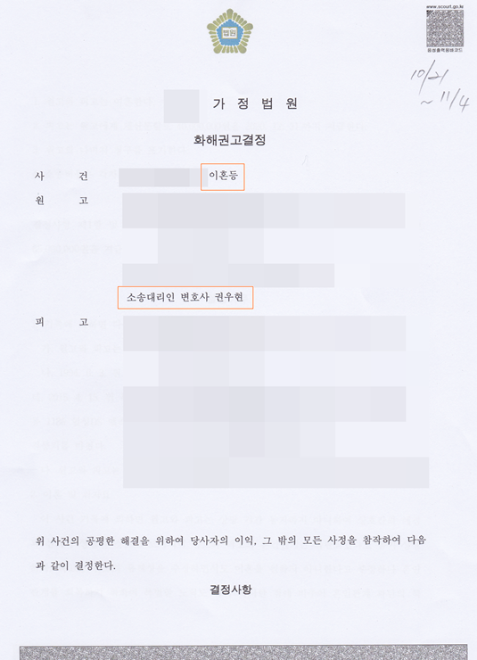 1. 아래 화해권고결정은 일견 유책배우자의 이혼청구로 이혼이 기각될 충분한 우려가 있음에도 소송대리인인 본인의 노력으로 부부의 현실 등 사안의 진상을 잘 밝힌 덕에, 혼인 파탄책임을 원,피고 모두에게 있는 것으로 돌려 이혼은 물론 재산분할까지 받는 내용으로 화해권고결정이 난 사례입니다.