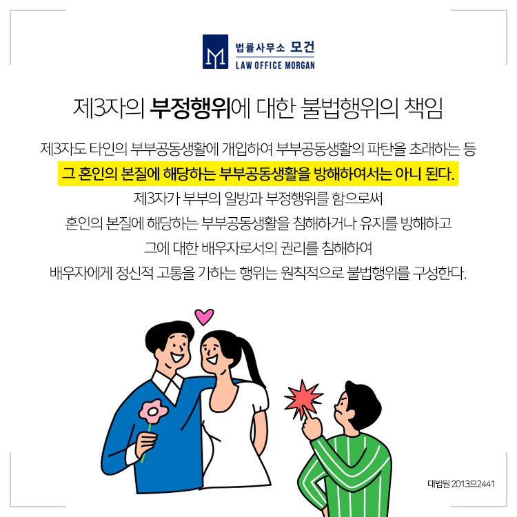 특히 이혼전문변호사이자 형사전문변호사인 이력을 살려 상간녀소송과 함께 맞물릴 수 있는 성범죄, 명예훼손, 무고죄 등의 형사소송에도 적극적인 대응을 도와드리고 있습니다. 상간녀소송을 비롯한 법적절차 전반에 대한 자세한 법률자문이 필요하신 분들은 법률사무소 모건으로 문의하시어 전문변호사의 조력을 받아보시기 바랍니다.