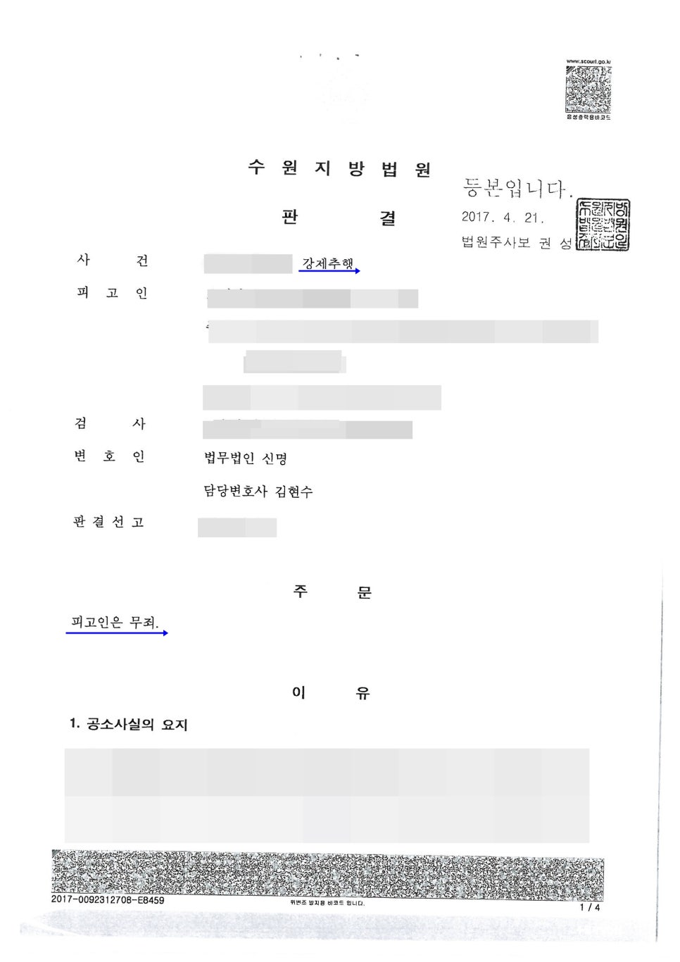사건의 결과 재판부는 위 증인들의 법정 증언에 비추어 보면 공소사실이 합리적 의심이 없을 정도로 입증되지 아니하였다는 이유로 의뢰인에게 무죄의 판결을 내려주었습니다.