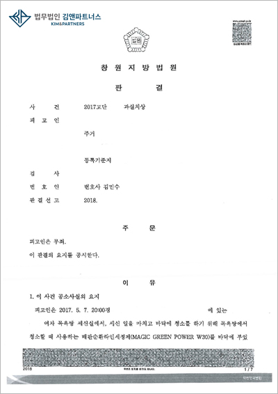 의뢰인은 목욕탕 청소를 하면서 일부러 세정제를 바닥에 부어 직장 동료에게 3주간의 치료가 필요한 상해를 입혔다는 내용의 과실치상죄로 기소되자, 자신의 무죄를 호소하며 사건을 의뢰하였습니다.