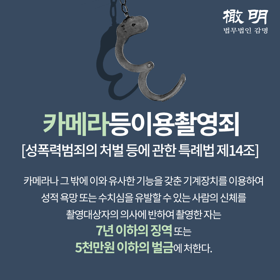 일반에게는 ‘몰래카메라’, ‘도촬’ 등의 용어로 더 익숙한 카메라등이용촬영죄는 성폭력범죄의 처벌 등에 관한 특례법 제14조에 규정된 범죄로, 카메라 등으로 성적 수치심을 유발할 수 있는 사람의 신체를 의사에 반하여 촬영하거나, 이와 같은 불법 촬영물을 유포하는 경우 등에 성립하는 범죄입니다. 카메라등이용촬영죄는 강제추행이나 강간 등과는 달리 신체접촉을 수반하지 않는 범죄로 죄에 대한 의식이 없거나 가볍게 여길 수도 있으나, 이른바 ‘몰카 범죄’를 심각하게 여기는 사회 분위기에 따라 그 처벌 수위는 점점 높아져 가고 있습니다.
