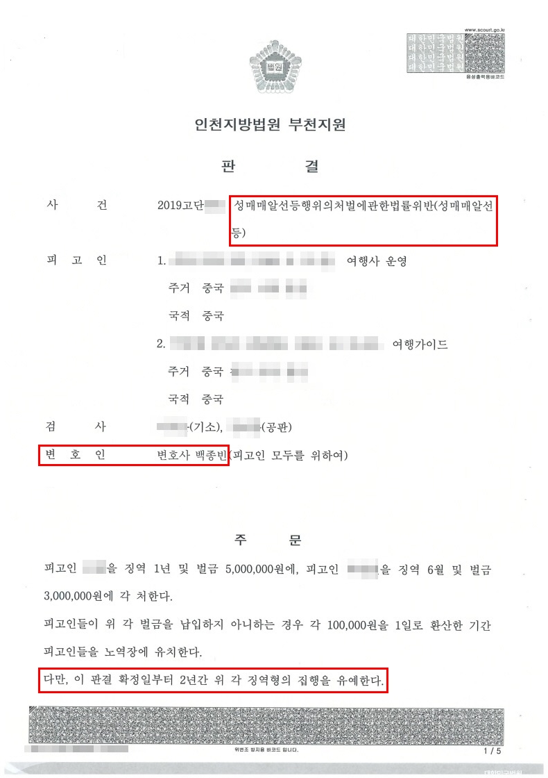 제19조(벌칙)② 다음 각 호의 어느 하나에 해당하는 사람은 7년 이하의 징역 또는 7천만원 이하의 벌금에 처한다. 1. 영업으로 성매매알선 등 행위를 한 사람 2. 성을 파는 행위를 할 사람을 모집하고 그 대가를 지급받은 사람 3. 성을 파는 행위를 하도록 직업을 소개ㆍ알선하고 그 대가를 지급받은 사람 3. 백종빈 변호사의 변론 A씨와 B씨는 일단 중국인이었고, 해외 원정 성매매의 규모가 너무 크고 성매애 알선 방식이 전파성이 높은 인터넷 매체를 이용하여 실형 선고가 유력시되는 상황이었습니다. 일단 본 변호사는 증거기록을 확보하여 분석하였는데, 본 변호사가 느끼기에도 해외 성매매의 규모, 방식, 수익 등 그 죄질이 너무나 좋지 않아 변호의 방향을 설정하기가 쉽지 않았습니다.