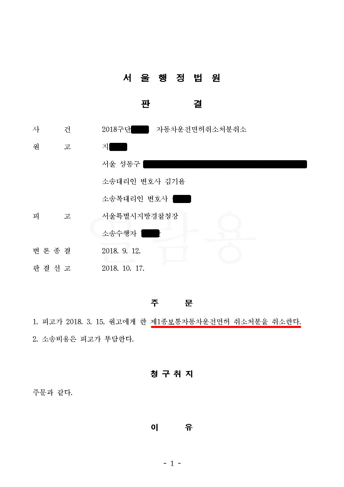 김기윤변호사가 수행한 운전면허가 취소된 사안을 구제한 사례입니다.