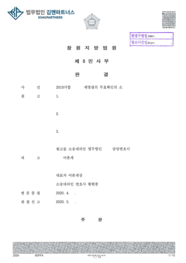 황변호사는 어촌계에서 일부 계원들에 대해 제명처분을 한 것이 무효라며 소송을 당한 어촌계를 변호하여