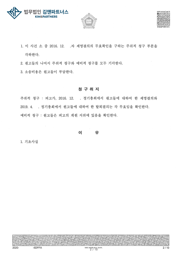황변호사는 사건을 정확하게 살펴본 후 원고들이 탈퇴 사유에 해당한다는 것을 증명하고 탈퇴 결의를 새로 하게 만들었습니다.