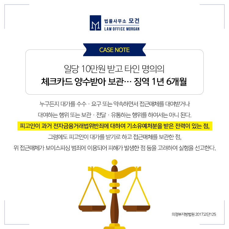 최근 본인이 피해자임에도 피의자가 되어 법의 처벌을 받게 되는 경우가 있습니다. 바로 「전자금융거래법」 위반 혐의에 휘말린 경우인데요. 「전자금융거래법」에서는 현금카드 등 개인의 전자식카드 등의 양도, 양수, 대여 등의 행위를 금지하고 있습니다. 이를 위반할 시 5년 이하의 징역 또는 3천만원 이하의 벌금에 처하게 됩니다.