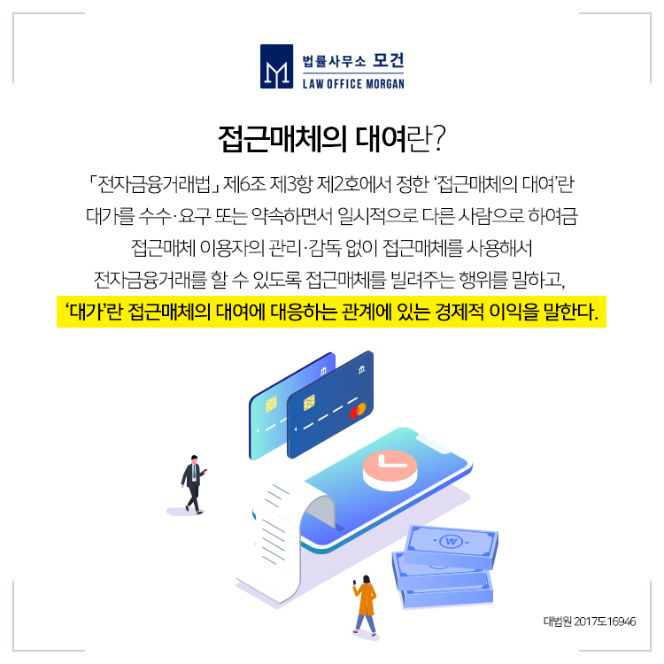 「전자금융거래법」에서 막고자 하는 행위는 접근매체를 교부받는 사람이 이를 사용·수익하게 하는 의미의 대여를 하면서 이러한 대여에 따라 제공하는 돈이나 보수를 의미하는 대가를 지급하는 행위를 의미하는데요.