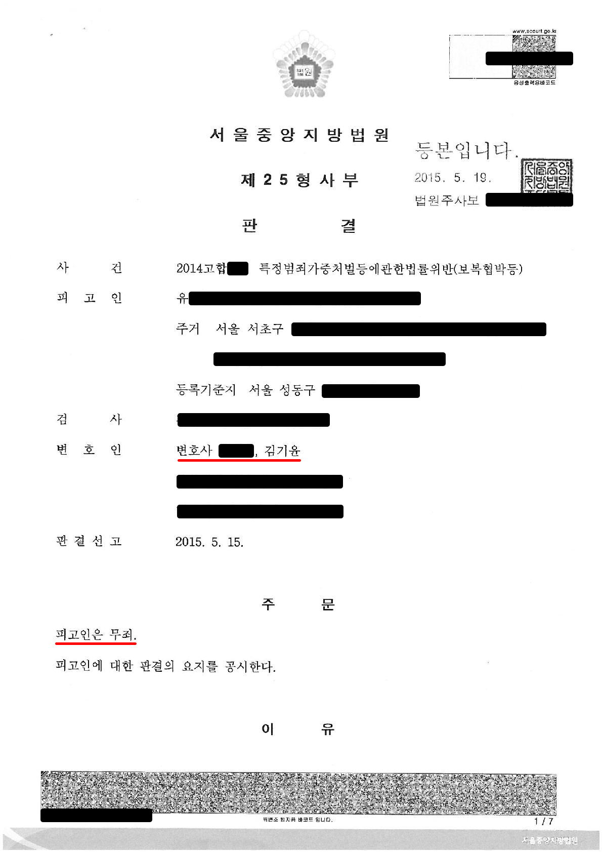김기윤변호사가 직접 수행하여 무죄를 이끌어낸 사건입니다.