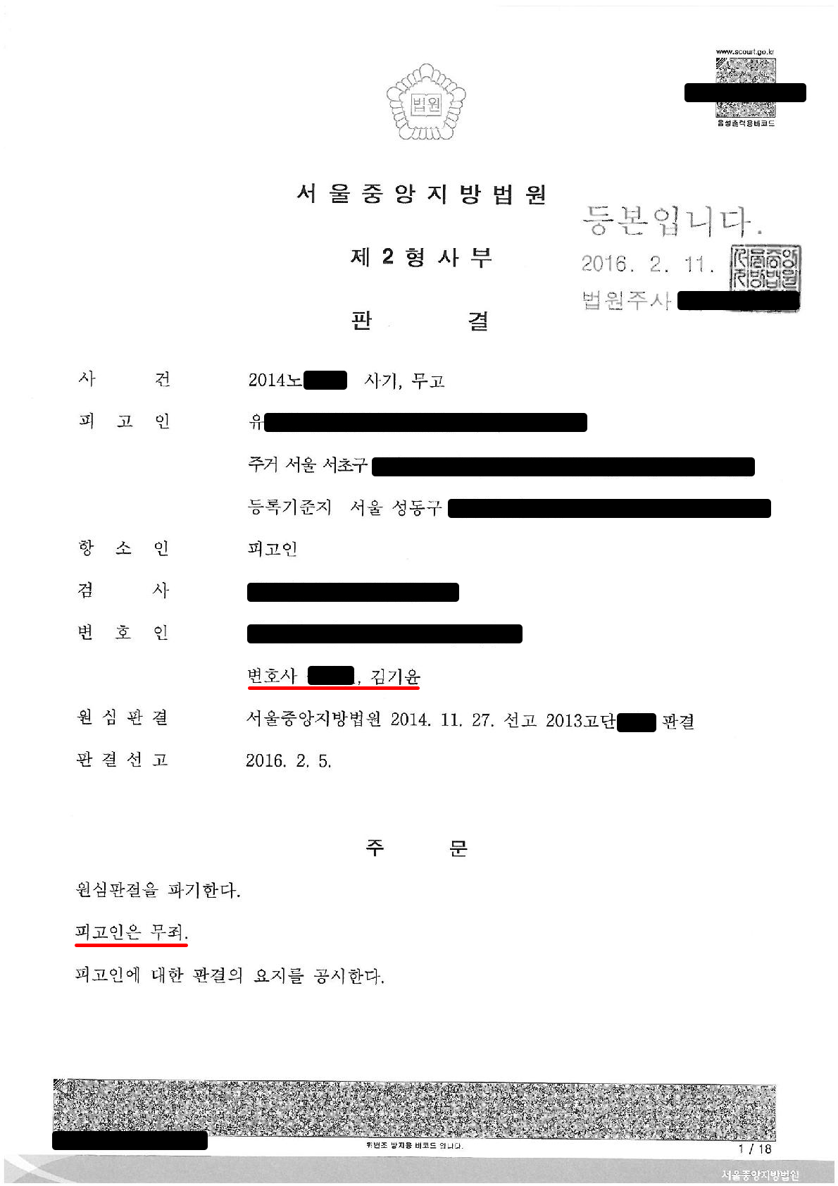 2심부터 맡아서 무죄판결을 이끌어 낸 사건입니다.