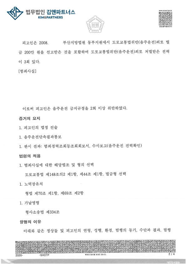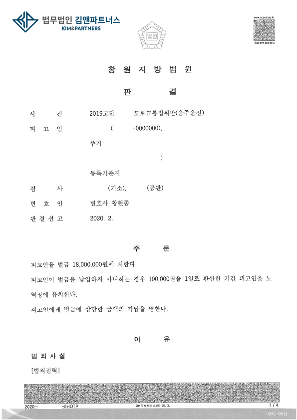 황변호사는 누범에 음주운전 3진아웃에 다시 음주운전으로 재판을 받게 된 의뢰인을 변호하여 벌금 1,800만원 판결을 받았습니다.