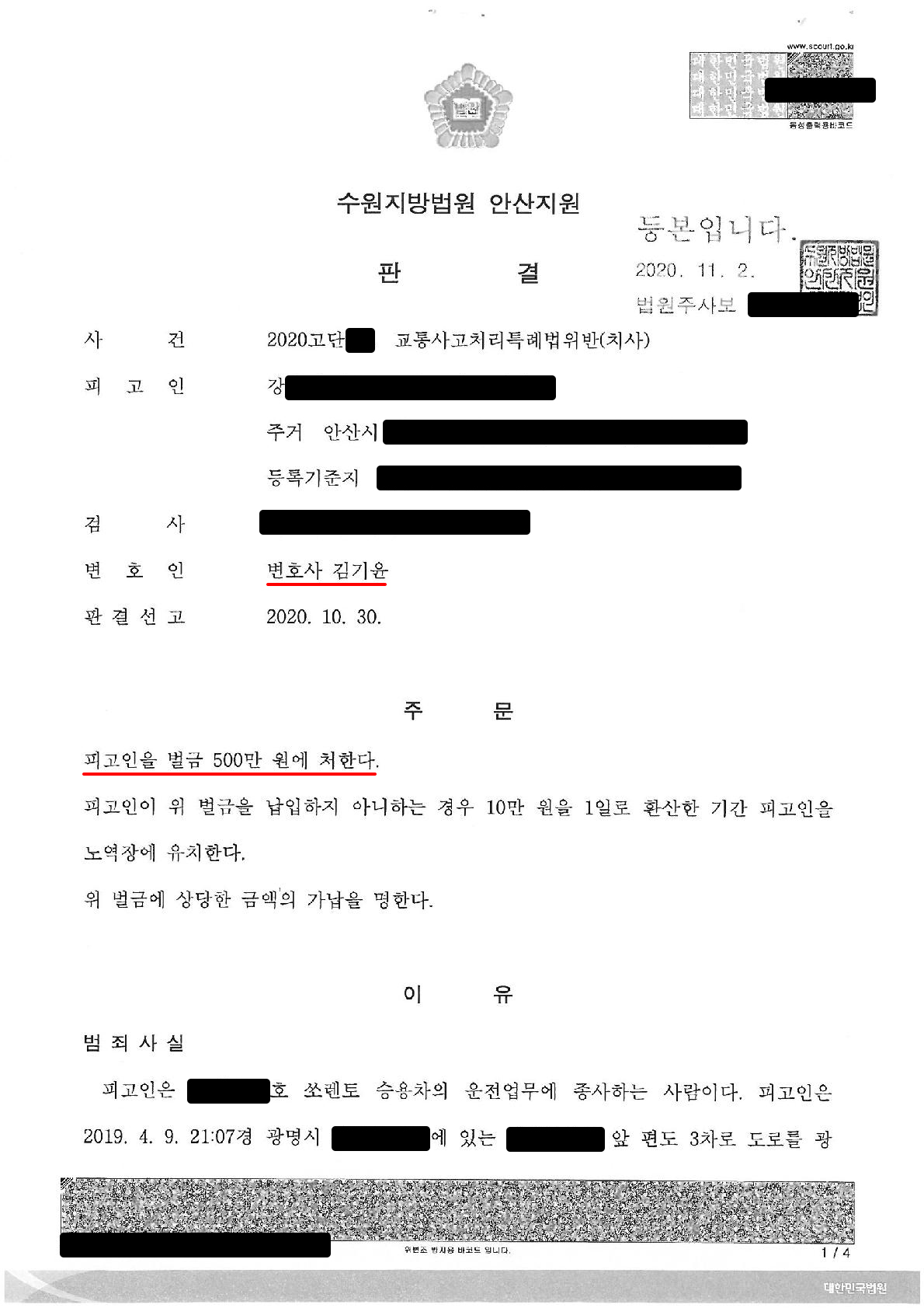 김기윤변호사가 직접 수행한 사건으로, 야간에 비오는 날 운전업무 도중에 교통사고가 발생하여 피해자가 사망한 사건입니다. 피고인은 자동차를 운전하는 공무원이었고, 직업상 집행유예 판결을 선고 받게 되면 직장에서 퇴사 당하는 사건으로, 본 변호인은 블랙박스 영상을 분석하였고, 빗속에 피해자를 발견할 수 없었다는 점을 착안하여 피해자를 발견할 시야확보가 어렵다는 점 등 예견가능성이 없었다고 해당 법리주장을 펼친 결과 벌금액으로 선고받은 사건입니다. 이에 따라 피고인은 직업을 유지하게 되었습니다.
