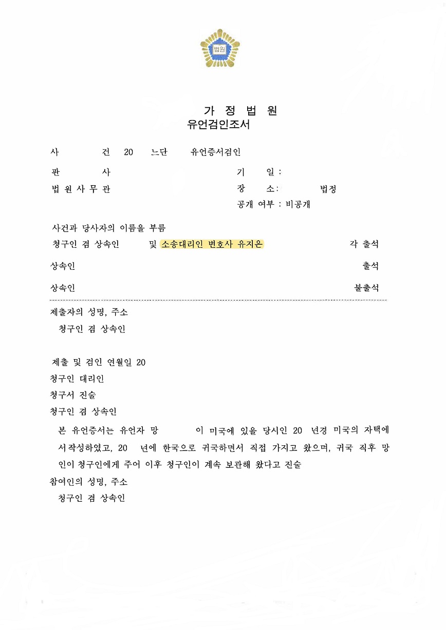 이에 상속재산분할 심판청구 소송이 아닌 자필 유언장을 집행하기로 하고 미국에 있는 공동상속인의 위임장을 받아 법원에 유언증서검인 심판청구를 하였습니다.