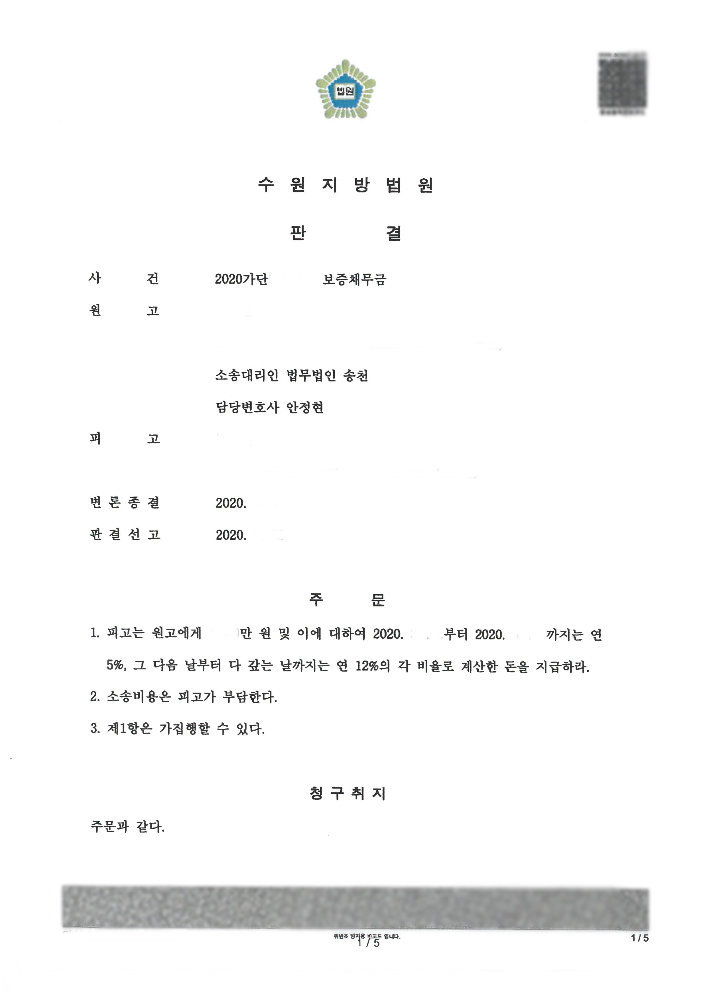 계약만료일이 지났는데도 새로운 임차인이 구해지지 않았다며 임대를 맞추기 위해 전혀 노력하지 않으면서 본인의 사정만을 이해해달라고 하며 보증금을 반환하지 않는 임대인을 상대로 내용증명을 발송하고 지급명령을 신청하여 보증채무금 청구의 소를 제기하고 청구취지에 지연이자를 추가로 청구하는 내용으로 청구취지를 변경하여 원금과 지연손해금까지 전부 승소 판결을 받았습니다.
