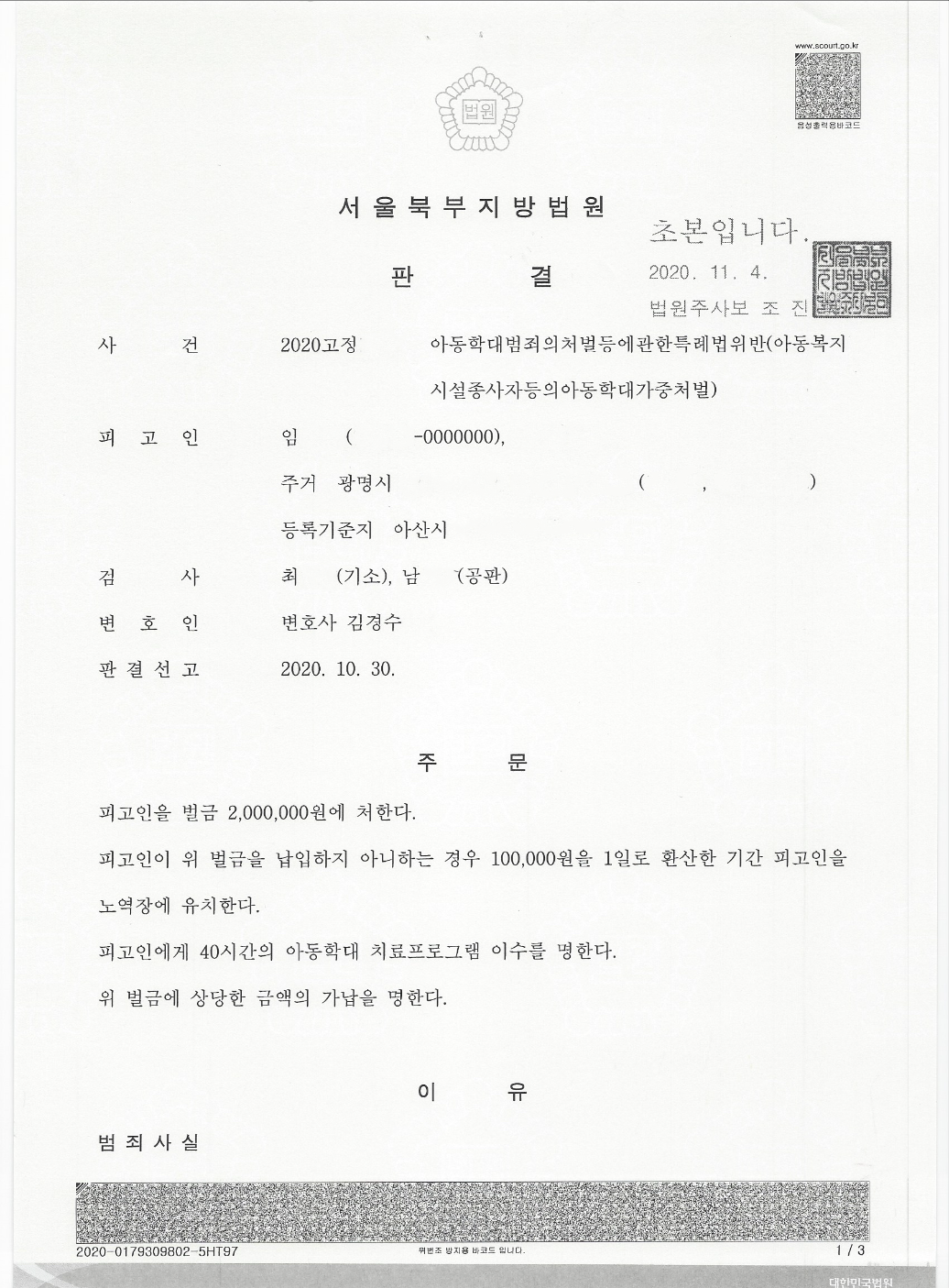 의뢰인의 아동학대범죄에 대하여 적극적으로 방어하여 벌금형 판결을 받았습니다