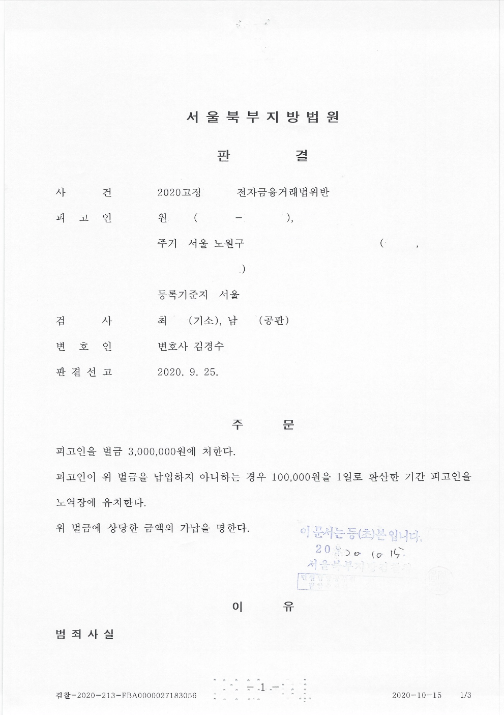 의뢰인의 전자금융거래법위반에 대해 벌금형 판결을 받았습니다