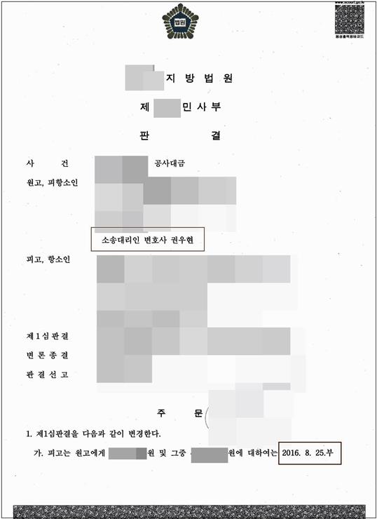 **공사대금 소송 항소심에서 승소한 사례를 하나 소개합니다.