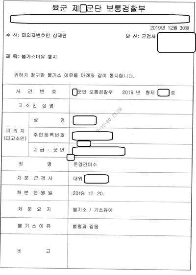 육군 제00군단 보통검찰부에서 선처를 해주었습니다. 혹시 이 포스팅을 보시는 분들이 오해를 하실까봐 미리 말씀을 드립니다. 같은 죄명이라고 하더라도 사안에 따라서 기소유예가 가능한 것이지 무조건 저만 선임하면 기소유예가 나오는 것은 절대 아닙니다.