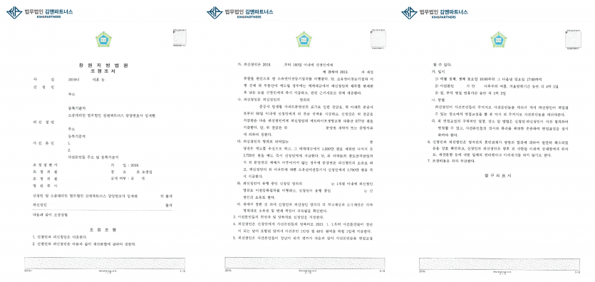 또한 본 변호사는 양육비의 경우 한 자녀당 월 400,000원씩 받을 수 있도록 하였고, 재산분할의 경우 아파트 1채는 의뢰인 소유로, 나머지 한 채와 분양권에 관하여는 매매대금을 의뢰인에게 지급할 수 있도록 합의를 이끌었으며, 이에 의뢰인이 요구하는 내용이 담긴 이혼조정신청취지와 동일한 내용의 합의서를 제출할 수 있었습니다.