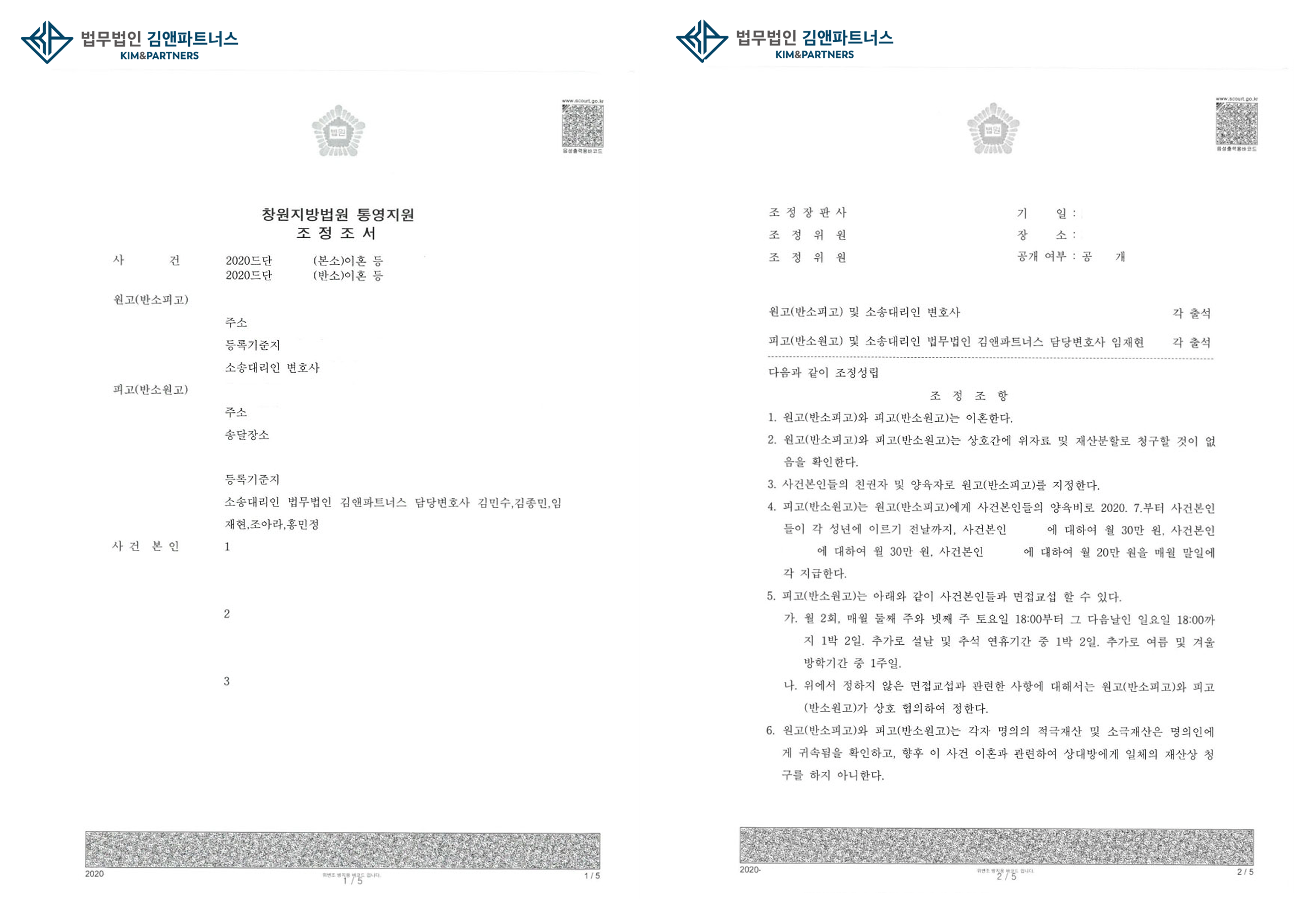 본 변호사는 의뢰인이 상대방을 폭행한 경위에 있어 참작할만한 사정 등을 상세히 기재하였고, 여러 가지 자료를 통해 의뢰인이 화목한 가정을 만들기 위하여 노력하였다는 사정들을 증명하였습니다. 또한 상대방이 이성들과 잦은 술자리를 가졌다는 사실에 관하여도 본 변호사의 노하우로 인해 입증할 수 있었습니다. 의뢰인에게 불리한 내용이 있어 상대방의 위 청구에 대하여 방어하기 어려운 사건이었으나, 상대방이 주장하는 의뢰인의 귀책사유는 다른 증거를 통해 방어하였고, 상대방의 귀책사유는 사실관계를 구체적으로 기술하여 상대방에게 반소를 제기한바, 이에 상대방과 원만히 조정에 이르게 된 사건입니다.