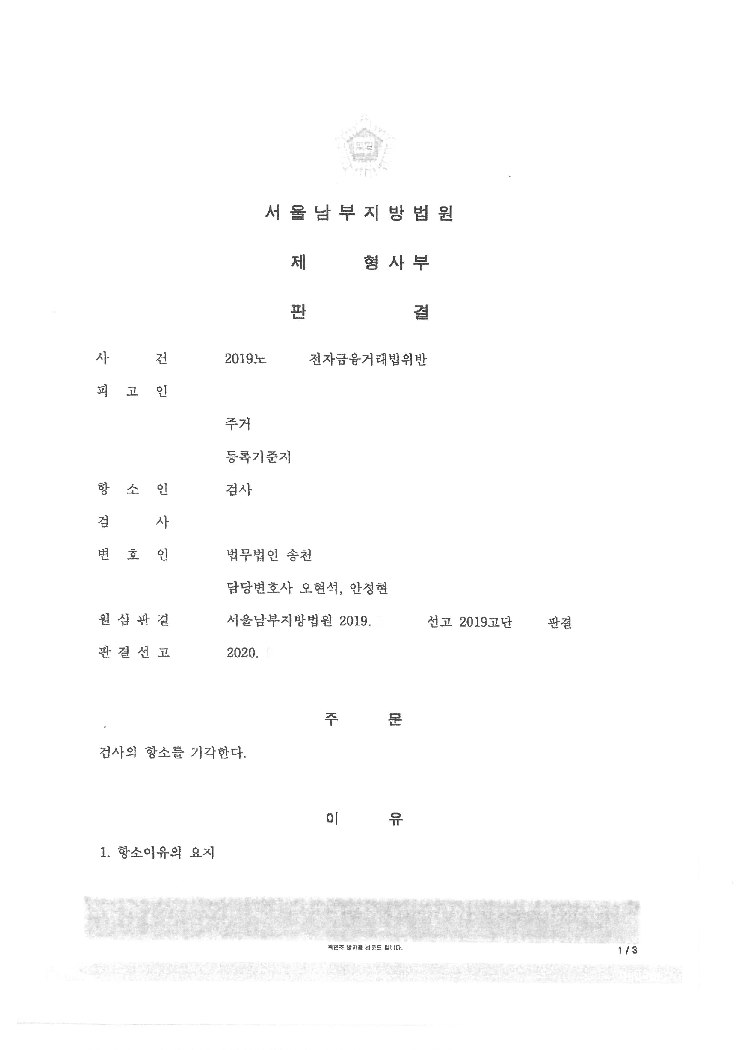 대출업제 직원을 사칭하는 성명불상자로부터 ‘원리금 상환을 위한 체크카드를 보내주면 대출을 해주겠다’는 제안을 받고 피고인 명의의 계좌와 연결된 체크카드 1장을 퀵서비스 기사를 통해 성명불상자에게 함으로써, 대가를 약속하면서 접근매체를 대여하였다는 혐의로 기소되어 1심에서 벌금 300만원을 선고 받았으나 검사가 항소하여 2심(항소심)에서 검사 항소 기각 판결을 받았습니다.