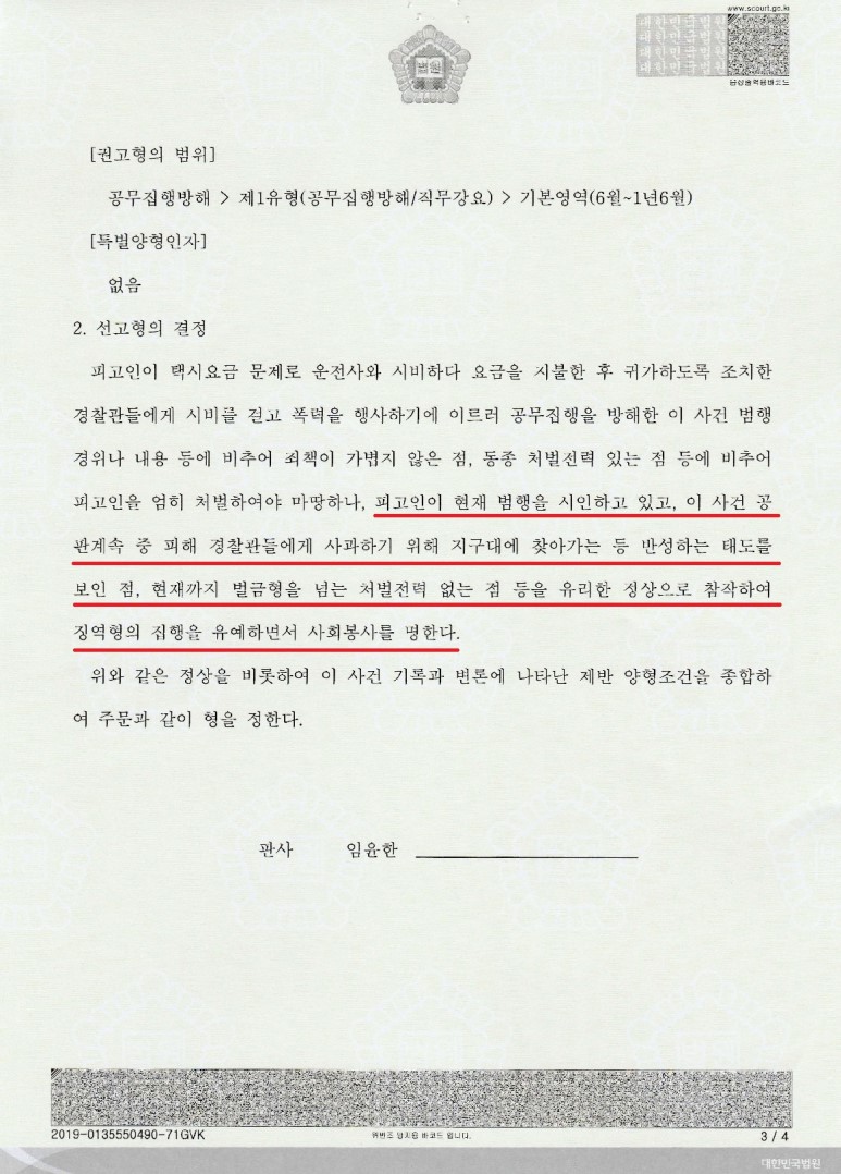 그리고 기록을 면밀히 살펴보니 목격자가 "경찰과 아저씨(의뢰인)가 서로 소리를 지르며 싸우고 있었다"고 진술한 부분이 있어 이 부분은 의뢰인의 우발적인 범행 및 경찰 또한 어느정도 책임이 있다는 취지로 인용하였고, 의뢰인이 잘못을 저지르기는 하였으나 경찰관이 술에 취했다는 이유로 한 쪽의 말을 무시한 채 일방적으로 사건을 처리했다는 점, 의뢰인도 처음에는 경찰의 지시에 따라 택시비를 모두 지급하였다는 점 등을 설명하여 의뢰인에게도 나름대로의 사정이 있었다는 점에 대해 변론요지서에 상세히 기재하였습니다.