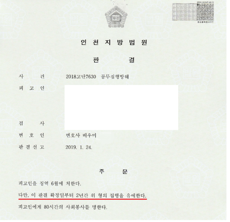 의뢰인은 공무집행방해의 동종전과에도 불구하고 집행유예 판결을 받을 수 있었습니다.