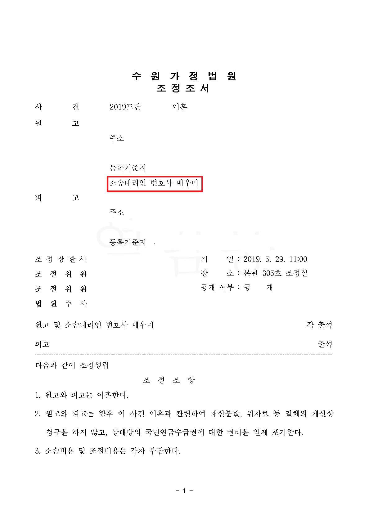 피고는 재산분할과 위자료 청구 이야기가 나오자 잠시 고민을 하더니 마음을 바꾸어 이혼에 동의하였고, 재산분할과 위자료 청구를 하지 않는 조건으로 이혼하는 조정에 성공하였습니다.