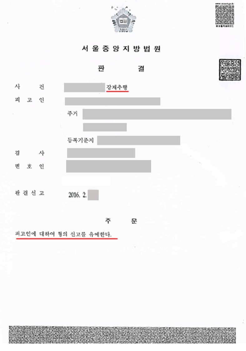 본 법인은 의뢰인이 초범이고, 평소 과로로 인한 스트레스 때문에 신년 맞이 회사회식에서 과하게 취했던 점, 피해자와의 합의는 이루어지지 않았지만 진정성 있는 사과를 한 점 등을 검찰 및 법원에 제출하였습니다. 아쉽게 검찰에서는 기소를 진행했지만 다행히 법원에서 본 법인의 조력을 참고하여 의뢰인에게 선고유예를 선고하였습니다.
