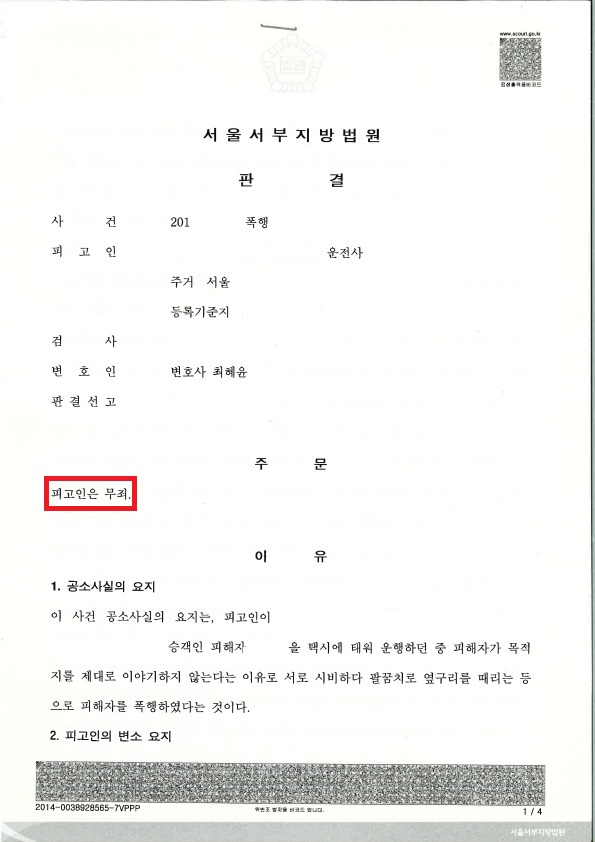 택시기사인 의뢰인이 승객을 폭행하였다는 혐의로 벌금형 약식명령을 받았고 혐의를 인정할 수 없어 정식재판청구를 하게 되었습니다.